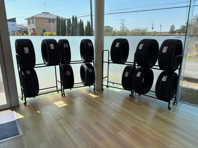今は仮置き状態ですが、コンチネンタル、ミシュラン、ヨコハマ、グッドイヤーのタイヤを4パターン展示します!